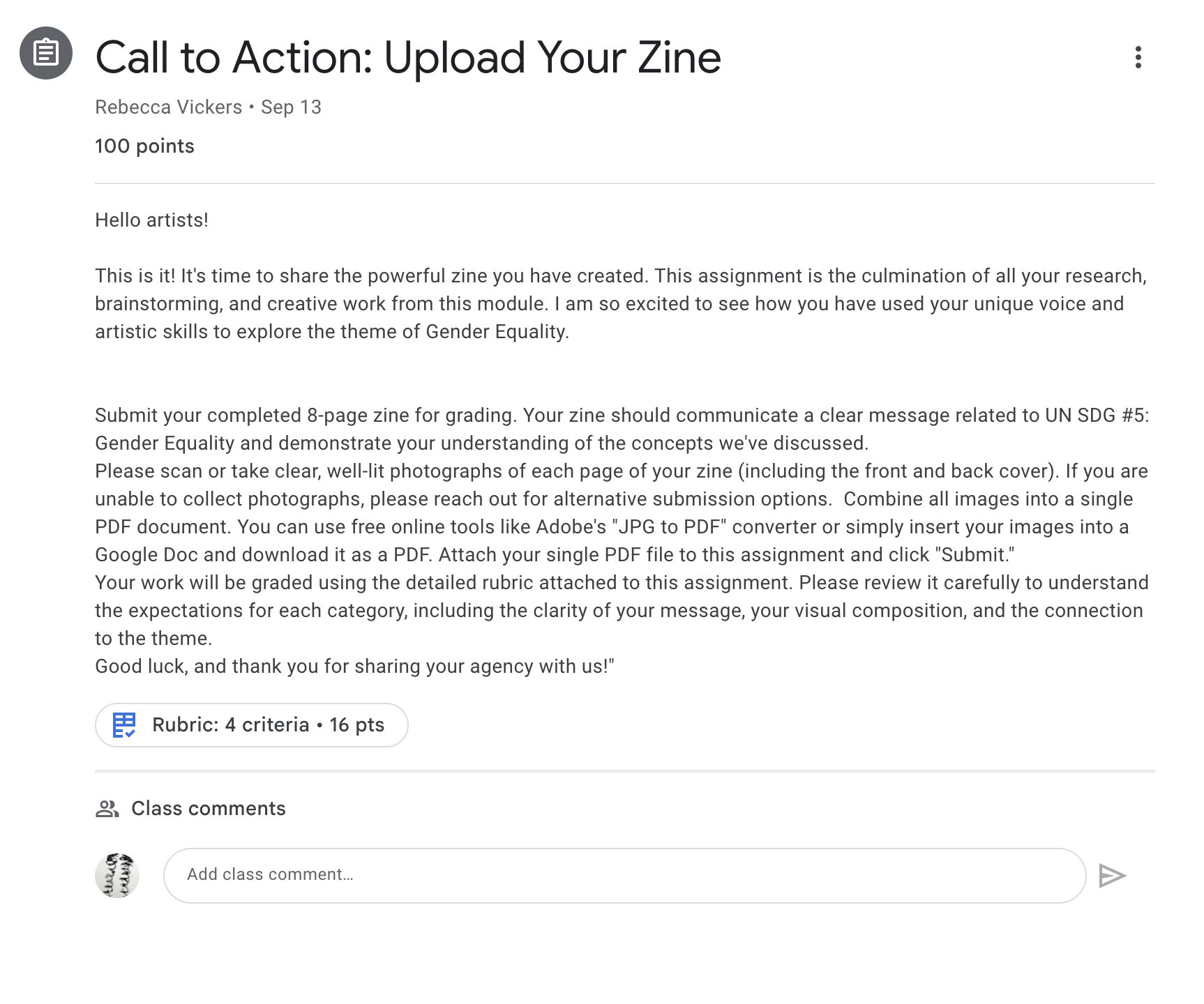 - Project-Based Learning Modules: The course is structured around three core hands-on projects. Each project module will challenge students to create a specific piece of art (a zine, an awareness campaign, a community map) that directly addresses a specific UN Sustainable Development Goal. I am not sure that I will complete all modules for this Capstone course, I intend for them to function as stand-alone classes as well but will see how many I can create in the time that we have.