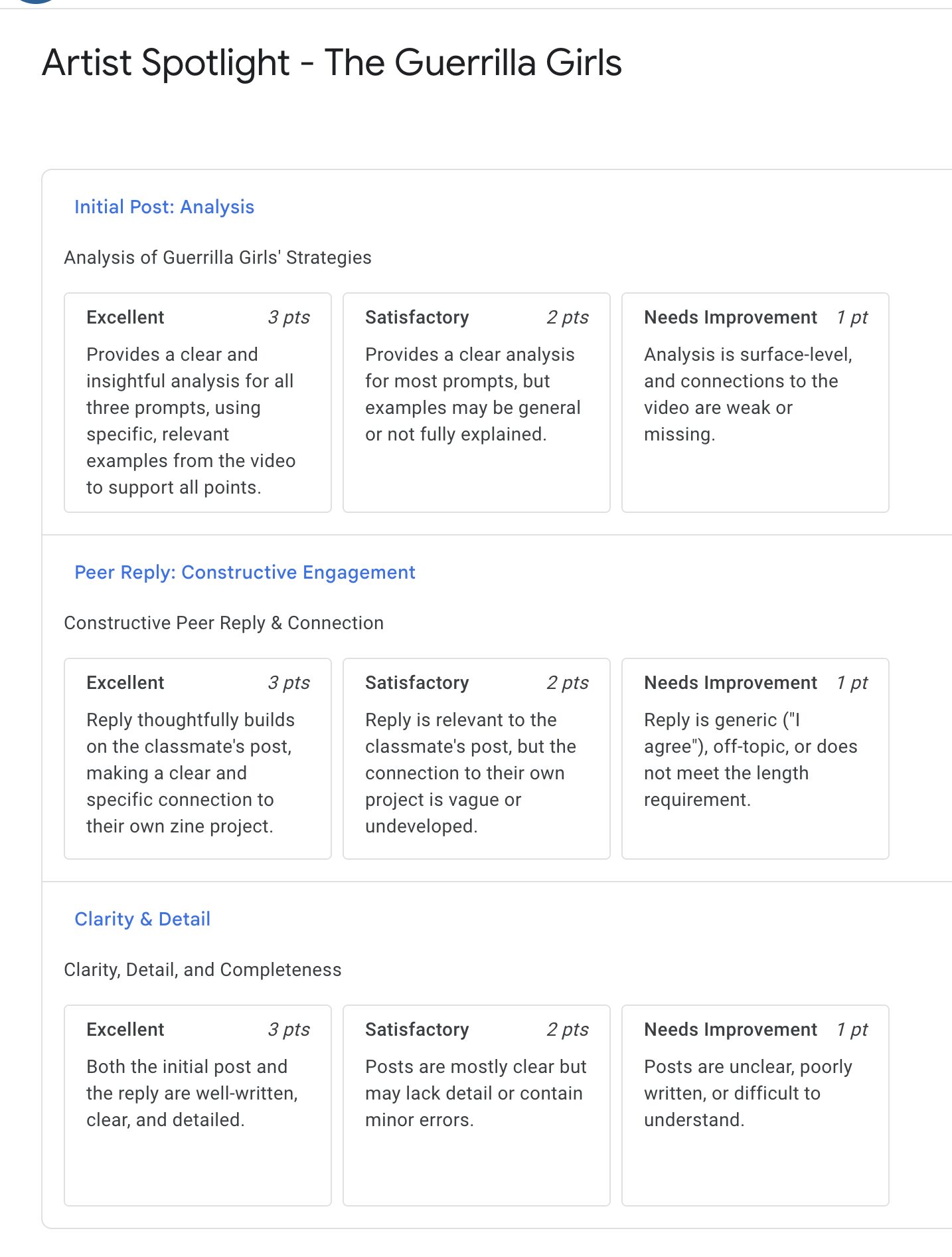 - Collaborative Peer Critique Hubs: Peer critique is one of the most valuable aspects of a learning environment when studying art. To foster a collaborative studio environment online, the course will feature some structured peer feedback activities. In key project modules, students will share their works-in-progress and use guided questions to provide constructive feedback to their classmates, even if asynchronously.