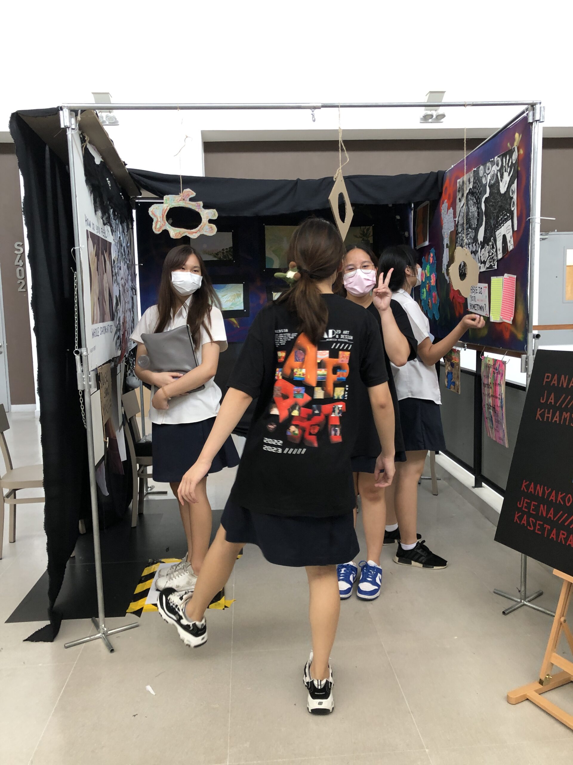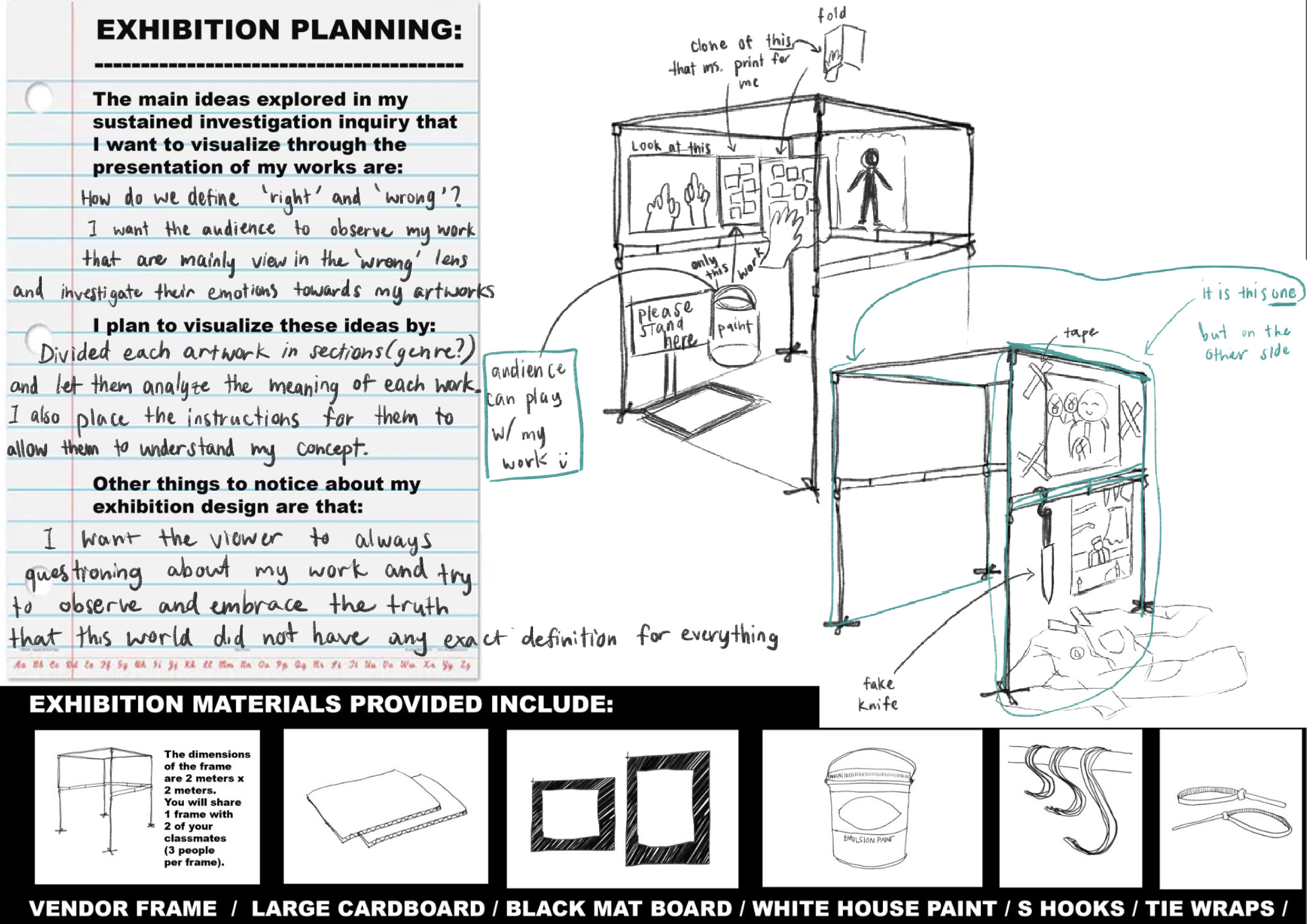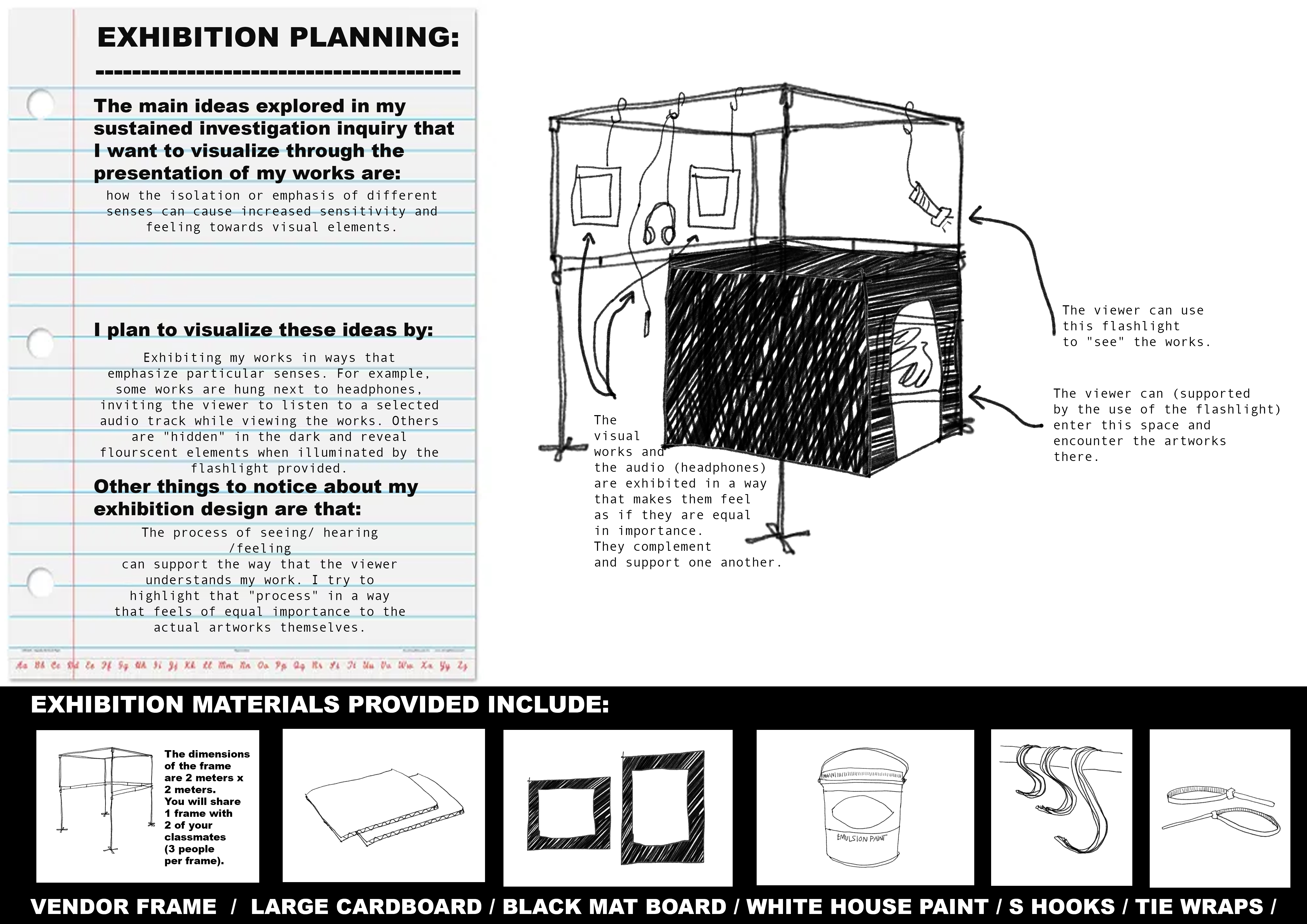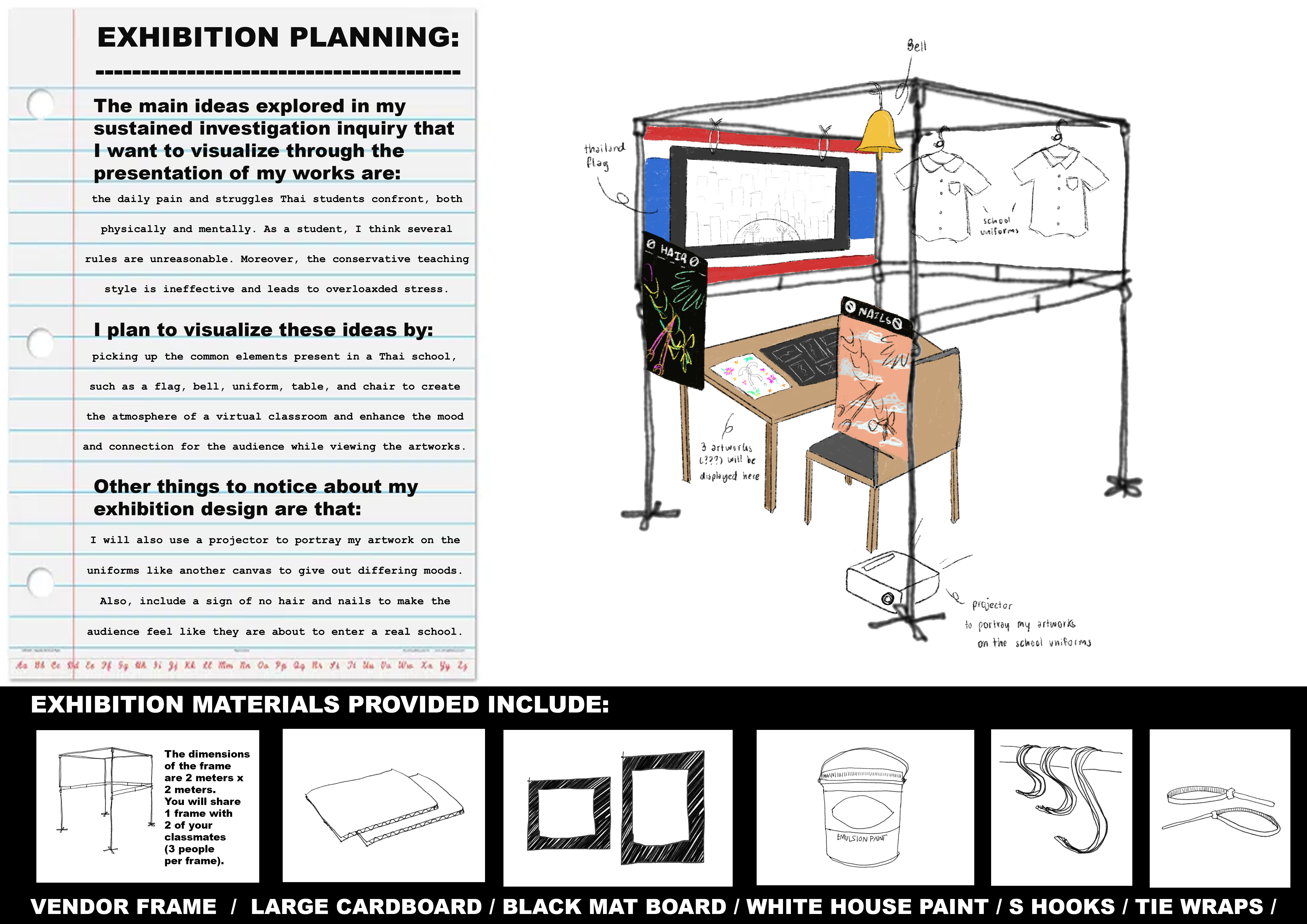 AP Art students were invited to develop a plan for exhibiting their work that, through its design, furthered the line of inquiry explored through their portfolios. They were asked to firstly identify, plan and sketch how the main ideas explored in their Sustained Investigation Inquiry could be visualized through their exhibition. Students then worked to select which works they wished to exhibit and physically create the exhibition design.